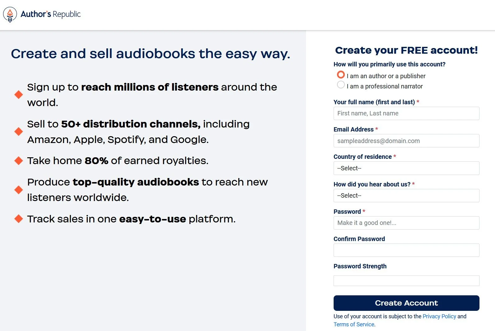 Once you create a free Author’s Republic account, you can create or upload a finished audiobook (opening, sample, chapter tracks, closing), set metadata and MSRP in your AR account, choose distribution options, and submit for distribution. Author’s Republic also offers production services and a narrator marketplace if you need narration or managed production.