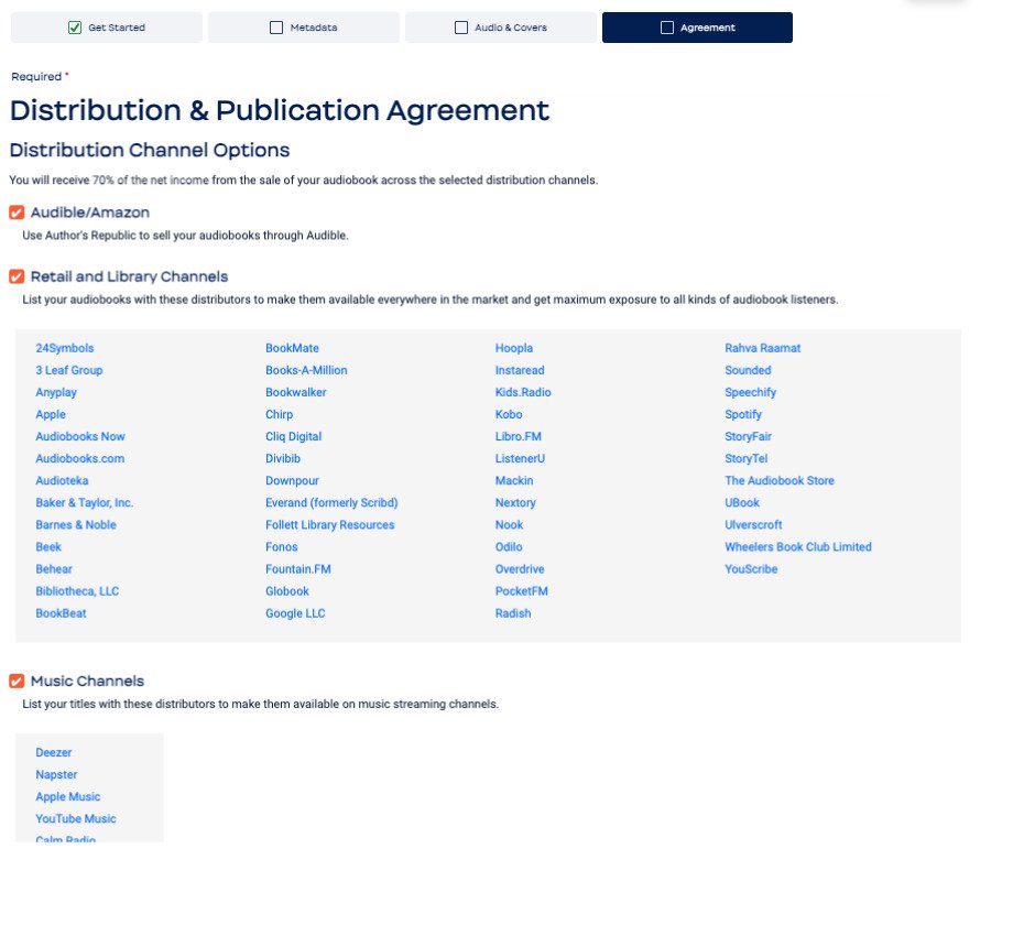 You’ll be asked if you want to distribute to Audible/Amazon. Check yes or no; if you say no, you’re welcome to use ACX, if you wish. You’ll be asked if you want to distribute to an extensive list of library and retail partners. Check yes or no. You’ll have to email Author’s Republic if you want to opt out of any individual retailers. Check yes if you wish to make your titles available through music streaming platforms.