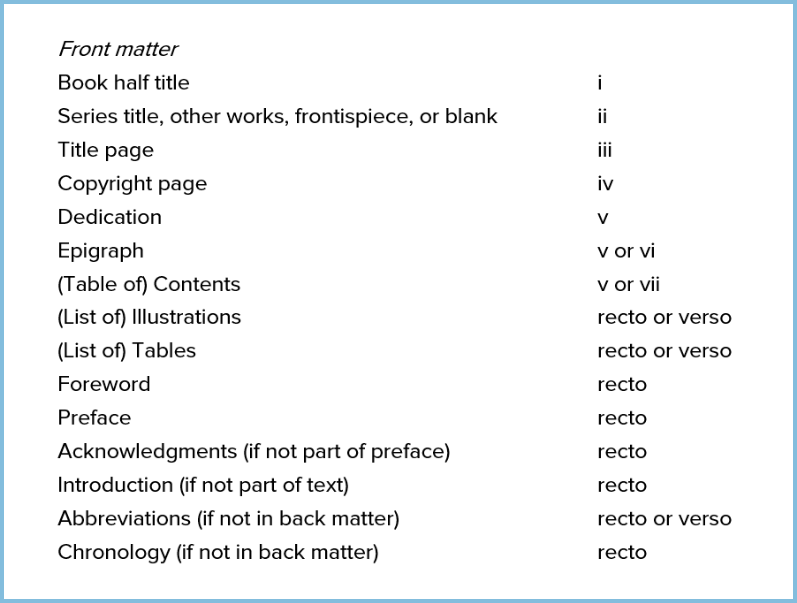 Where does the dedication page go in a book? Here’s the page numbering for front matter, as specified by The Chicago Manual of Style.