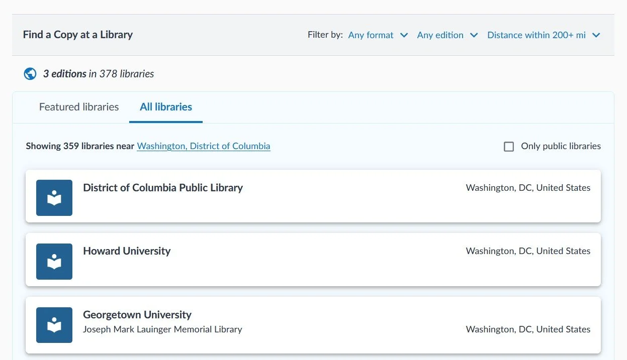 You’ll see a list of libraries that have the item you’re interested in, organized by how near the libraries are to you. (FYI, our hypothetical researcher is based in Washington, DC.)